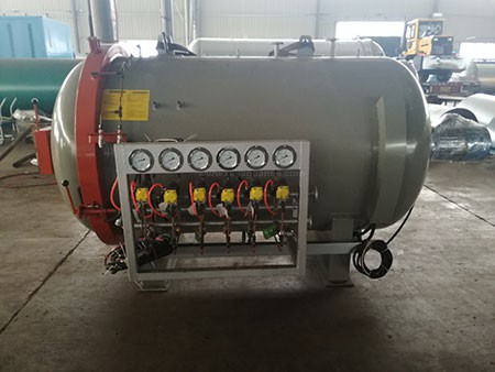 在工作的過程中罐內(nèi)會有抽真空的步驟,一般來講該設(shè)備都是多路抽真空的,罐外可以看到有著一排的真空表進行每一個管路進行抽真空,我們?yōu)榱俗寜毫_到我們想要的結(jié)果還要對罐內(nèi)進行加壓,壓力作用于制品上這樣就能更快的滲透和固化使得整個熱壓固化過程加速,一般來說現(xiàn)在的熱壓罐都是高壓熱壓罐。